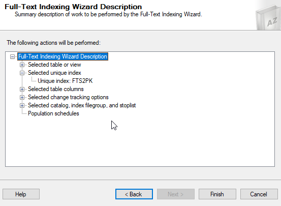 Everything in SSMS uses T-SQL under the covers. Often, you can get the code from a dialog in SSMS and use that for repeatable operations. For FTS, that’s not the case. When we get to the end of the wizard, there is no “Script” button.