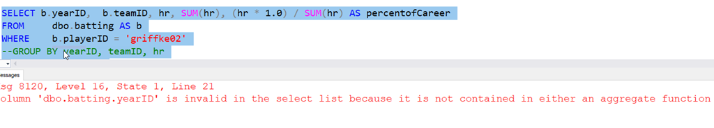 In the last post, I examined the career of Ken Griffey, Jr., showing his home runs with some ordering. That wasn’t a very realistic case of using data, so let’s look at another one. Suppose I want to know the percentage of his career home runs he hit during each one of his seasons. That’s an interesting question, showing some idea of how much he improved or declined. If I try a to start combining a “normal” aggregate with other data, I can’t do it without a GROUP BY.