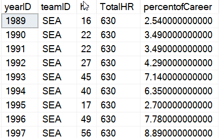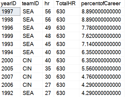 WITH cteHR (PlayerID, TotalHR) AS ( SELECT b.playerID , SUM (hr) FROM dbo.batting AS b WHERE b.playerID = 'griffke02' GROUP BY b.playerID) SELECT b.yearID , b.teamID , hr , TotalHR , ROUND((hr * 1.0) / TotalHR * 100, 2) AS percentofCareer FROM dbo.batting AS b INNER JOIN cteHR ON cteHR.PlayerID = b.playerID WHERE b.playerID = 'griffke02' ORDER BY b.yearID;