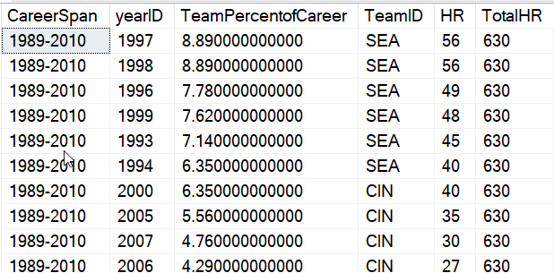 SELECT CAST(MIN (b.yearID) OVER (ORDER BY (SELECT NULL)) AS CHAR(4)) + '-' + CAST(MAX (b.yearID) OVER (ORDER BY (SELECT NULL)) AS CHAR(4)) AS CareerSpan , b.yearID , ROUND ((b.HR * 1.0) / SUM (b.hr) OVER (ORDER BY (SELECT NULL)) * 100, 2) AS TeamPercentofCareer , TeamID , HR , SUM (b.hr) OVER (ORDER BY (SELECT NULL)) AS TotalHR FROM dbo.batting AS b WHERE b.playerID = 'griffke02' ORDER BY TeamPercentofCareer desc;