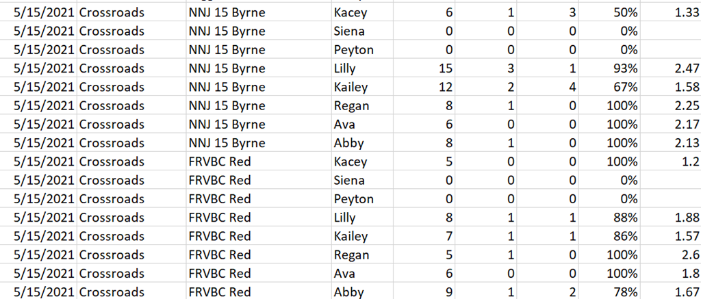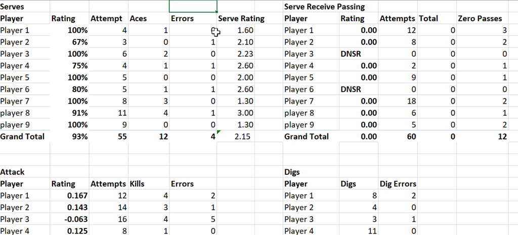 Since I will report on different areas, I decided to keep a master sheet for each report area. This means I have a “serve” worksheet, as well as others for Serve Receive, Attack, Digs, Blocks, and Assists. I can also add in new sheets as needed.