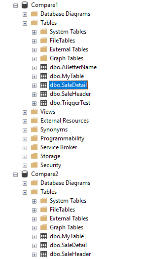 Imagine you have tables in two databases, dev and prod. In this case, I have a SaleHeader and SaleDetail in both the Compare1 and Compare2 databases.