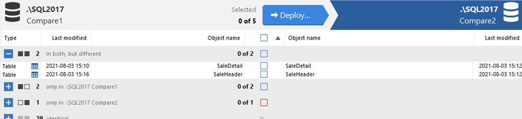 Once I click the checkbox and re-compare the databases, the view is similar, though the SaleDetail table doesn’t appear in the list of different objects.
