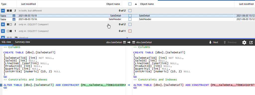If I look at the SaleDetail table, I see the only difference is the constraint.