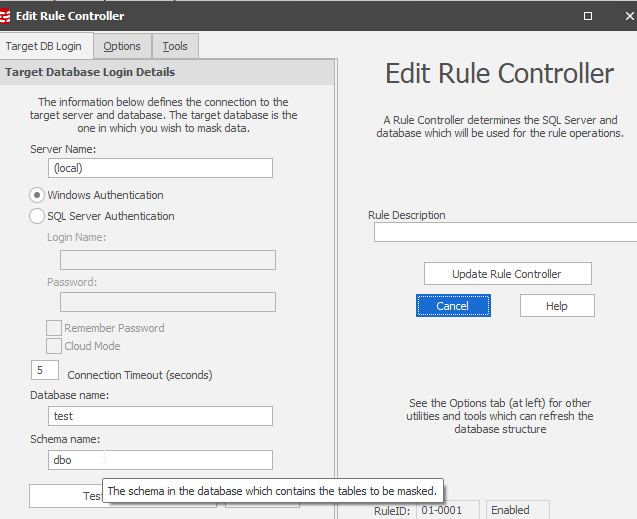I was lucky enough to work with the developer of the Data Masker product, who contracted with Redgate for a bit after the acquisition. I emailed him in frustration and he spent a little time explaining the architecture decision. Since Data Masker can connect to multiple databases for different situations, the connection is actually in the controller. This allows one masking set to handle multiple databases.