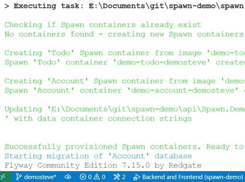 With Spawn, I just create a new branch in VS Code. Then I click F5 again. Now I see that I need new containers. These are created with the branch name. Therefore I see demo-todo-demosteve and demo-account-demosteve as the new containers.