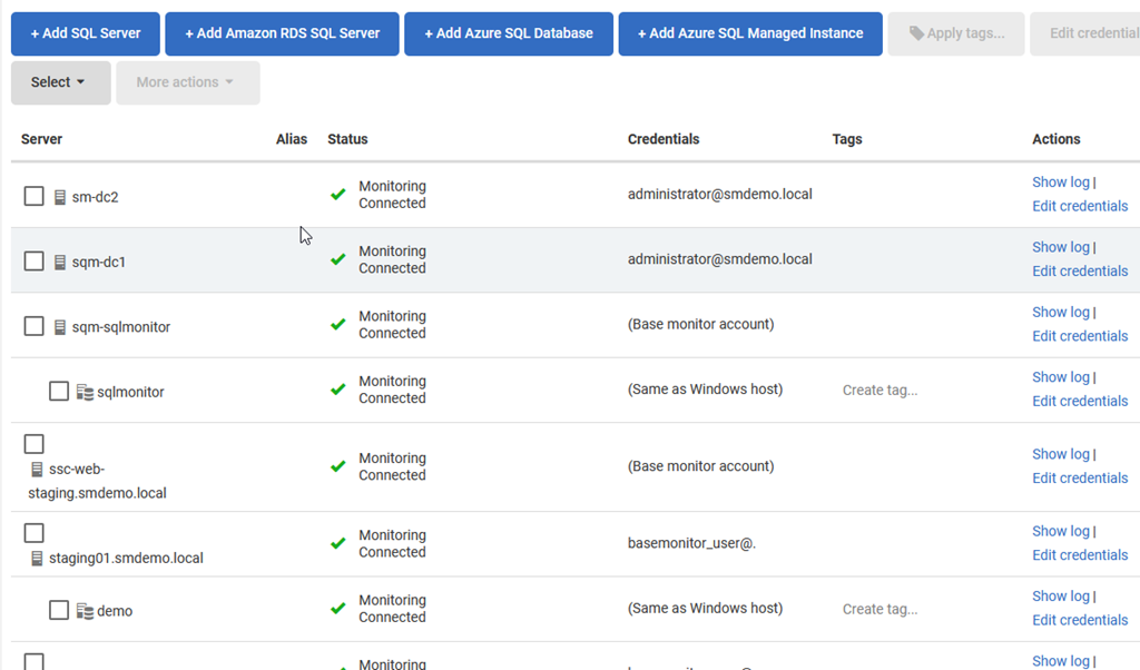 In the demo system, there aren’t any set up yet, but you can see where these are added in the Monitored Servers configuration. You can create multiple tags for a database or select multiple databases and apply a tag to all of them.
