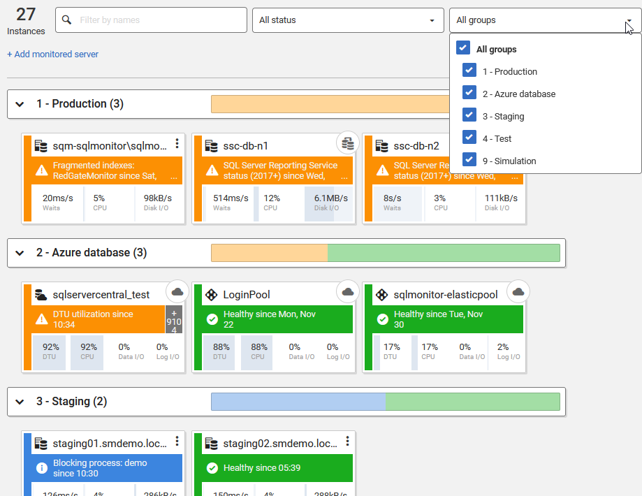 While plenty of software comes up with ways to group and filter items, often they are done in a way that doesn’t fit the needs to the user. An example of this is categories in SQL Monitor. They’re good, and people use them, but they aren’t enough. You can see the grouping/categories below from monitor.red-gate.com. The filter is at the top and the various cards are grouped under the three areas: Production, Azure database, and Staging.