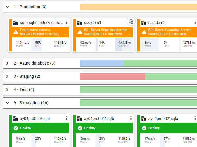 One of the additions that was added across the last few months is tagging. Traditionally the monitored instances and databases are organized in categories, which is OK, but very limited. Below you can see at monitor.red-gate.com that we have instances in various categories: production, azure database, staging, test, and simulation.