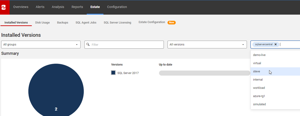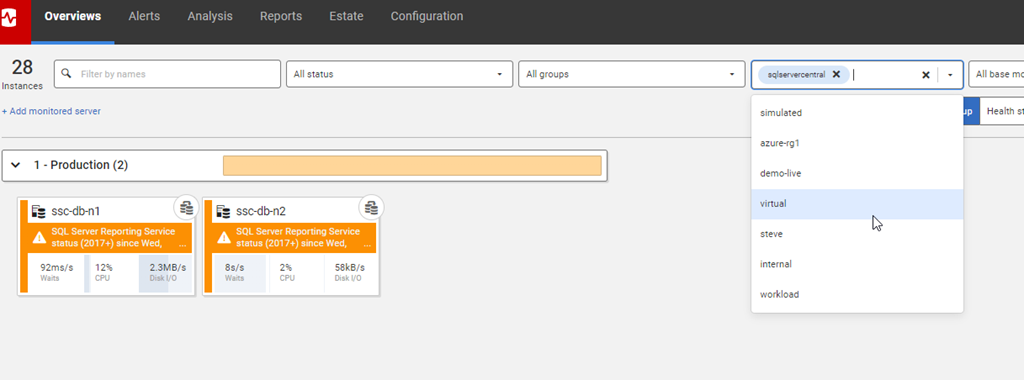 At the top of the global dashboard shown above, there is a new filtering area where we can filter by tags. You can see below that I’ve filtered the 28 instances in our demo setup to the 2 that have the “sqlservercentral” tag.