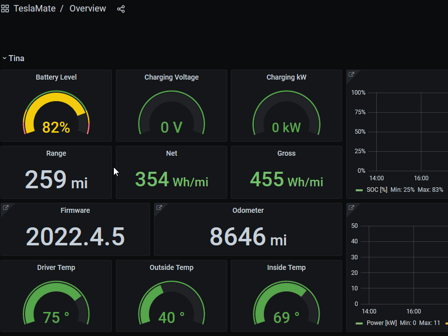 Then I found TeslaMate, a project that a Tesla owner built, allowing you to run your own service, capture data in a PostgreSQL database, and run your own dashboards in Grafana. There’s a lot of setup here, but I decided to run it in Docker, which was easier. My plan is to move this to the cloud at some point, but for now it’s on my home machine.