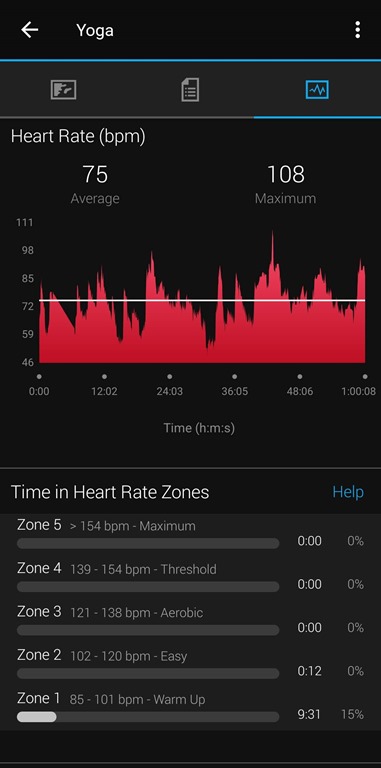 I usually only look at my effort level for yoga afterwards. Here you can see I wasn’t working hard enough on this day, but I can decide then how I view that. Sometimes I need a break, and that’s fine. Sometimes I see this and it reminds me to work harder tomorrow.
