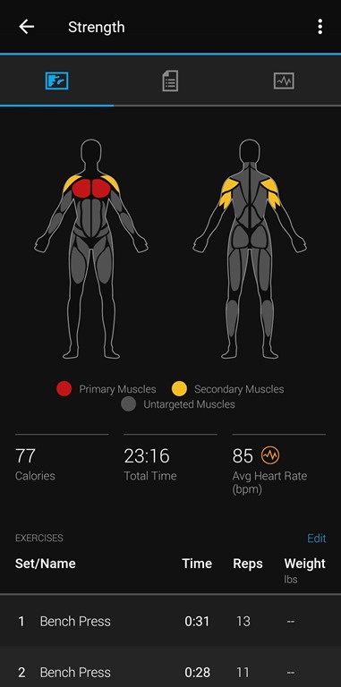 For weight lifting, the app guesses pretty well for some exercises, but not all of them. I could edit these, but I don’t bother. I’m more concerned with time and heart work here.
