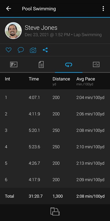 I tend to find 2:00-2:05 is pretty pace for me to stress myself. If I get above 2:06, either I’m slacking, or my body is worn out and I don’t realize it. A minute or two here, against what I thought my effort level was helps me evaluate my stress and sleep.