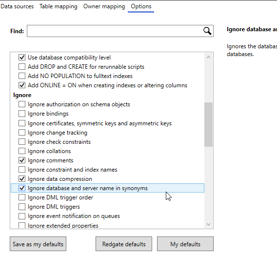 This same option applies in all our products that use the SQL Compare engine, so SQL Change Automation, SQL Source Control, Flyway Desktop, and the various automation components, all of which are in the Redgate Deploy. If you find your synonyms aren’t being deployed, make sure you have this option unchecked.