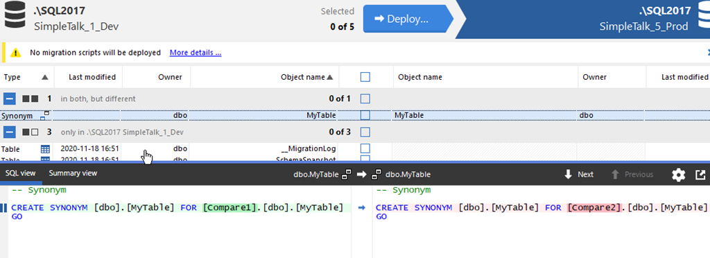 When I get to production, I have “Sales” and “Finance” databases. I need the synonym pointed to Finance, even though I might take code from these dev databases and commit to version control. There’s certainly a development challenge here in this scenario, but let’s ignore this. Let’s just assume we want to determine that we’ve actually made a change here.
