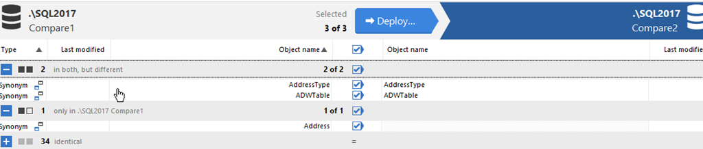 Next, I’ll add a couple more synonyms to show a few differences and then re-run the compare. Now I have 3 objects, 2 of which are different, one doesn’t exist in the comparison database.