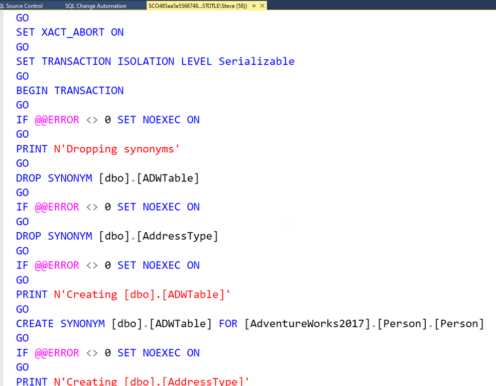 The last thing to do if this script is to set up a new database is to remove the synonym drop statements. We can’t alter synonyms, so we need to drop them. That will be an error in this script if the synonyms don’t exist. Since this runs as a transaction, the entire thing will fail.