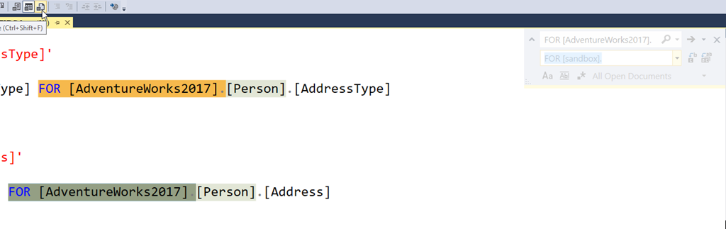 A customer was using SQL Compare and they wanted to update the database name in a script to point to a new database. They had objects in a development database pointing to another development database. What they asked was: “How can we search and replace across all objects to change db1.dbo.mytable to db2.dbo.mytable?”