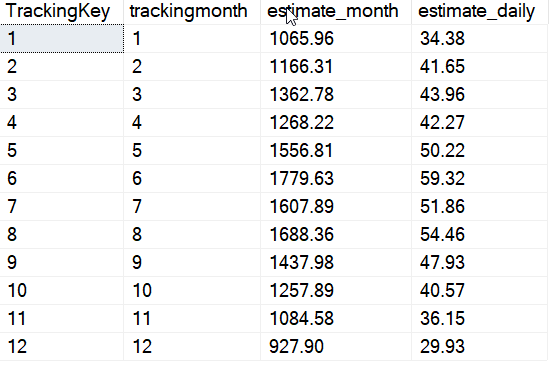 This is very simple query to write. It’s really a join between the two tables, based on the month. If I join on month, then the data from the estimate is returned for each row of actual data where the month’s match.