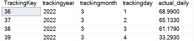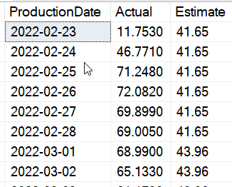 On a daily basis, I want to know if the system is producing more or less than the estimate for that month. If you remember from the previous post, there is a single row in a table for each month and then a row in a different table for each day.