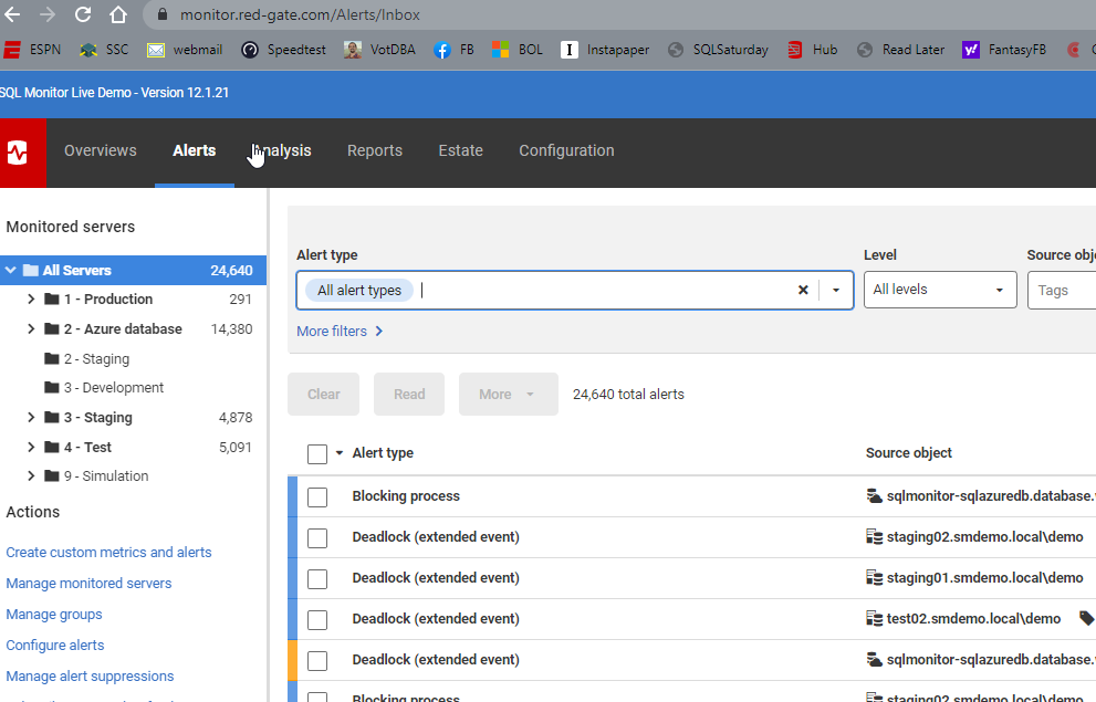 If I go to monitor.red-gate.com, there are a lot of alerts raised across our test systems. While each individual card shows the current alerts, there are more behind the scenes. I’ll write about the cards another time, but in this post, let’s just look at the Alerts tab.