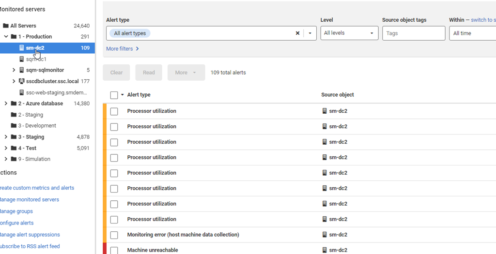 While I can click on the server groups on the left and limit the views to a group (or a server), there are still a lot of alerts. The Production group shows 291 below.