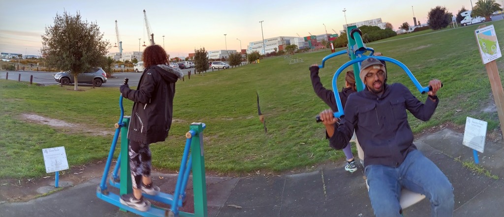 We met in Christchurch, the family coming from the US and me coming from Australia. We drove down the Eastern coast of the South Island in New Zealand and stopped at a park for a break. Everyone enjoyed some of the equipment in the park before we went down to Dunedin for the night.