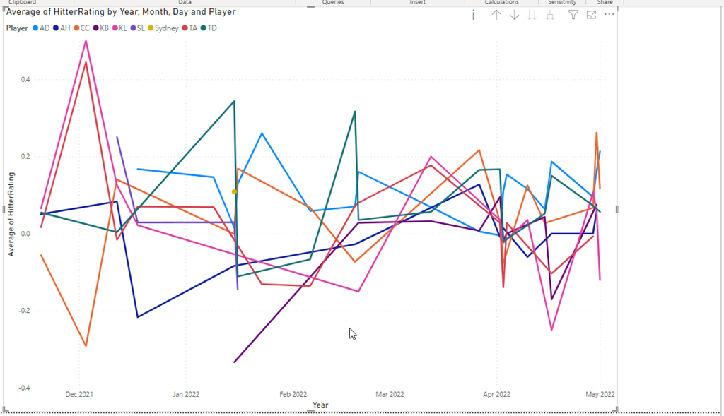 I have a basic report with a line graph. It looks like this once I’ve added in the value to capture at the Y, the date as the X, and the player as the legend.
