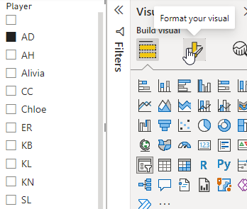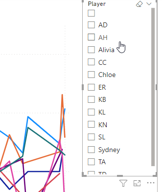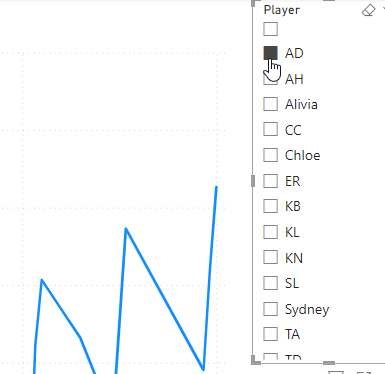 I’ll add a slicer to the report and drop the players in there. I see the players, but I don’t have an easy way to select all of them.