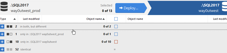 When I compare the databases, I see changes that are in all states. Some only in one or the other, some different, some the same. At this point, I don’t really care about counts or what’s different, so I don’t need to expand this list.