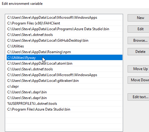 Now add an entry for the folder where you extracted the Flyway files. For me, this is c:\utilities\flyway.