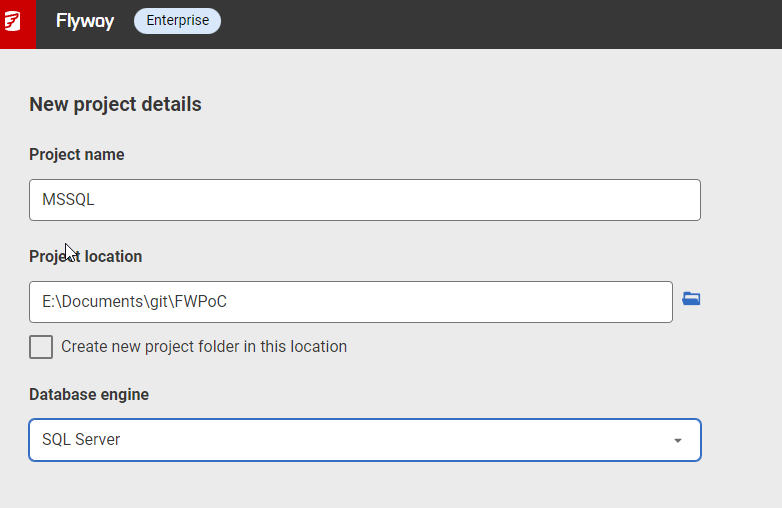 The first project I’m setting up is my SQL Server project, in a folder called MSSQL under the root of the git repo. This is a project folder just for Flyway Desktop. Once I create the folder, I’m going to create a new project in FWD.