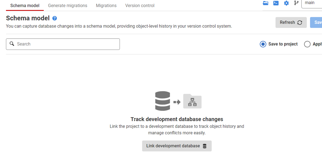 Once this is created, I start in the Schema Model tab. I hate this nomenclature, as it’s weird. This is the list of objects whose code I’m capturing. There’s nothing here, because I need to link this to my development database.
