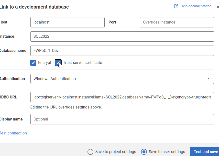 The process is the same. I’ll link this to a dev database. I need to specify the port and database I’m using. I also specify the schema here, as it’s not the default.