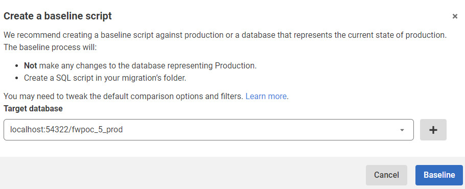 I do, however, need a baseline. I need the baseline marker in my databases to note that we have a base version. This will give me a starting point, but also ensure that FWD creates migrations that are numbered higher than my baseline.