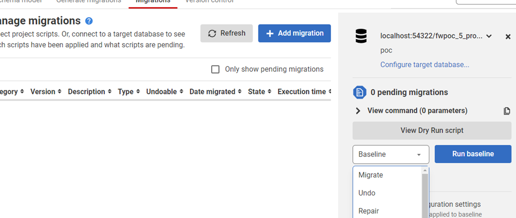 I click Baseline and it goes to work. There’s nothing there, so this returns back to the blank, Generate Migrations tab.