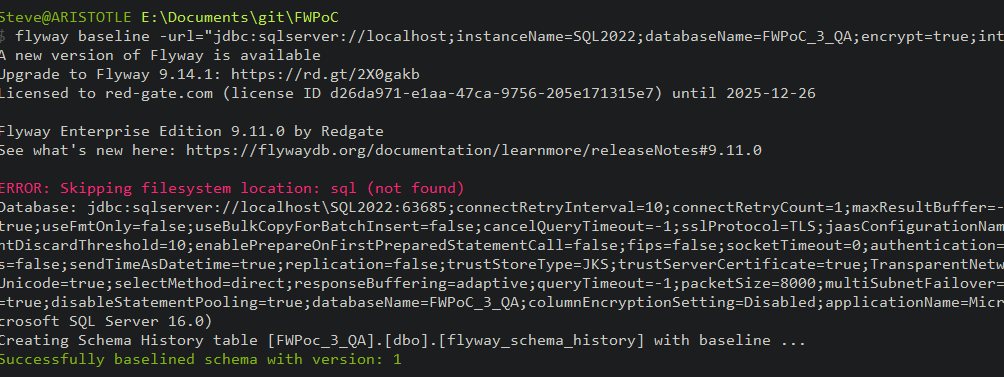 However, there is no baseline or schema tracking table. I didn’t have a poc schema, so perhaps that’s an issue, but that’s OK. We can fix this.