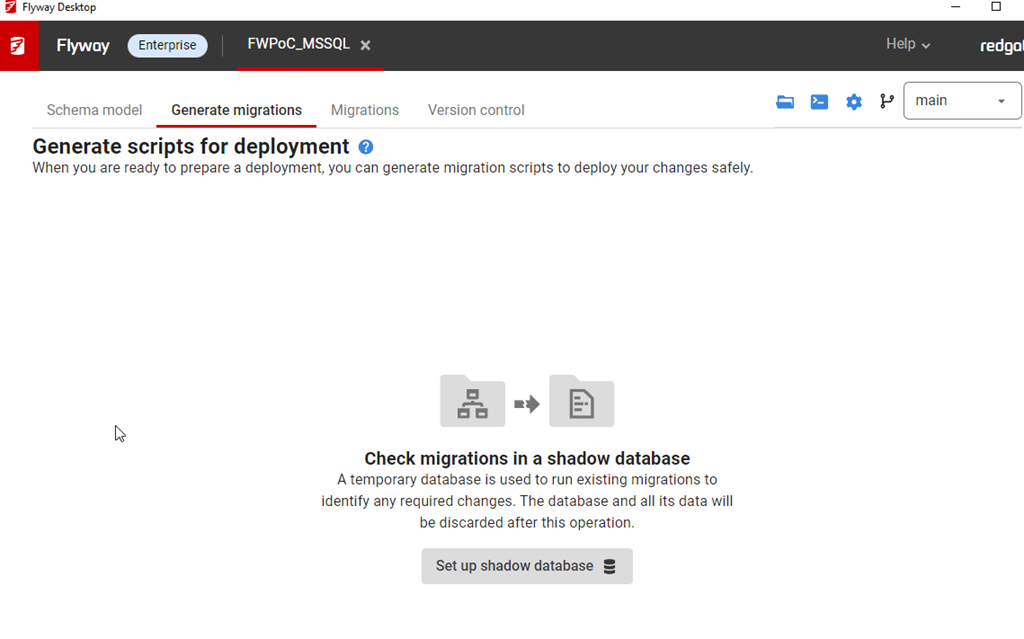 The shadow is essentially a development V-1 (v minus one) version. This is where I test all migrations, compare the state with development, and then determine what’s changed. This is just a regular database, but I create this outside of Flyway Desktop. For me, I created a database (FWPoc_1_Dev_Shadow) and then clicked Set up shadow database to get this dialog. You can name this anything.