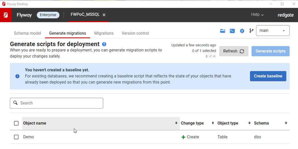 Once this is done, I now see another prompt on the Generate Migrations tab. Now I need a baseline script. I don’t have anything, but I will click the button.