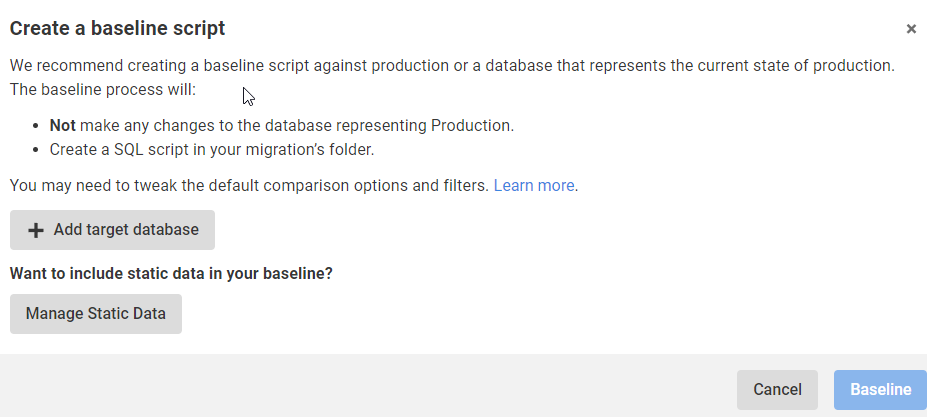 This gives me a dialog to pick a target database. This target is used to get the initial set of objects to populate in the baseline script. You can use production or a copy (recommended) as the target database.
