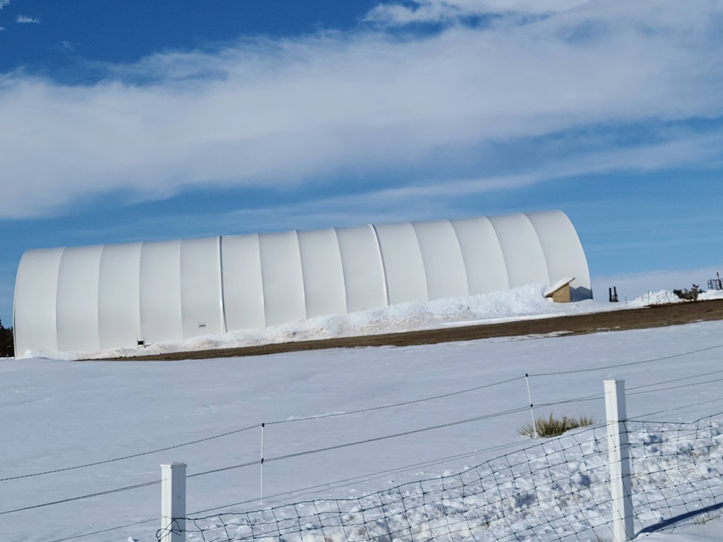 This is a fabric building, made of a steel frame that’s anchored to the ground and fabric pulled around it. The fabric is actually secured by weaving straps through the frame. Here’s a good shot of how this works, albeit with a broken strap. We actually had to climb up here and tie a new strap to the existing one to secure things. Another skill, but a simple one. Mostly climbing and tying strings.
