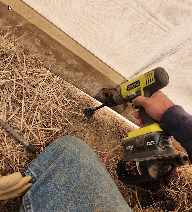 This steel pole is secured to the bottom frame with a threaded rod. You can see a couple of these in the image, with a washer and nut on it. These go through the pole and screw into the frame that’s on the ground. The nut is tightened and holds the walls down in the wind. There is some space in some places where the wind and go in and out, which allows pressure to equalize inside and outside the building, and also helps the frame resist strong winds by having it flow through.