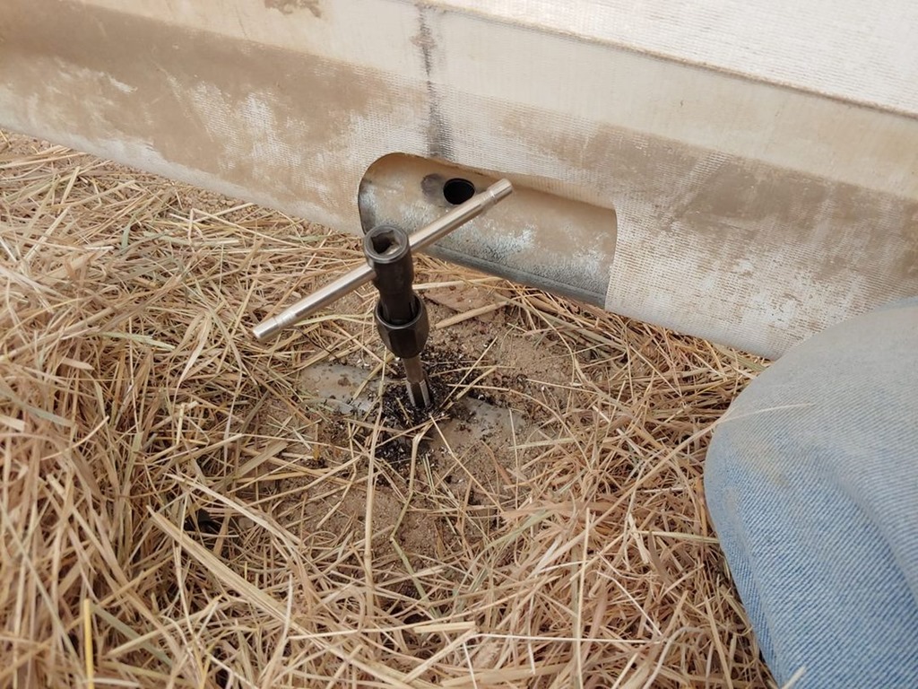 Once I have this through the metal, I usually can easily go up and down a bit, threading it into and out of the hole. This is really only about 1/2-3/4” of metal as the horizontal tube below is hollow.