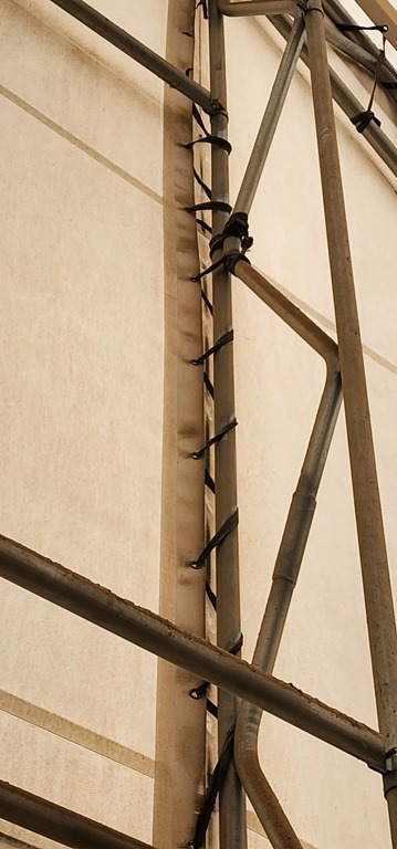 I didn’t think much of this when the building was built, but at some point my wife told me a rod had broken and the building was flapping. In this case, part of the wall was moving, which wears the fabric down and can tear it.