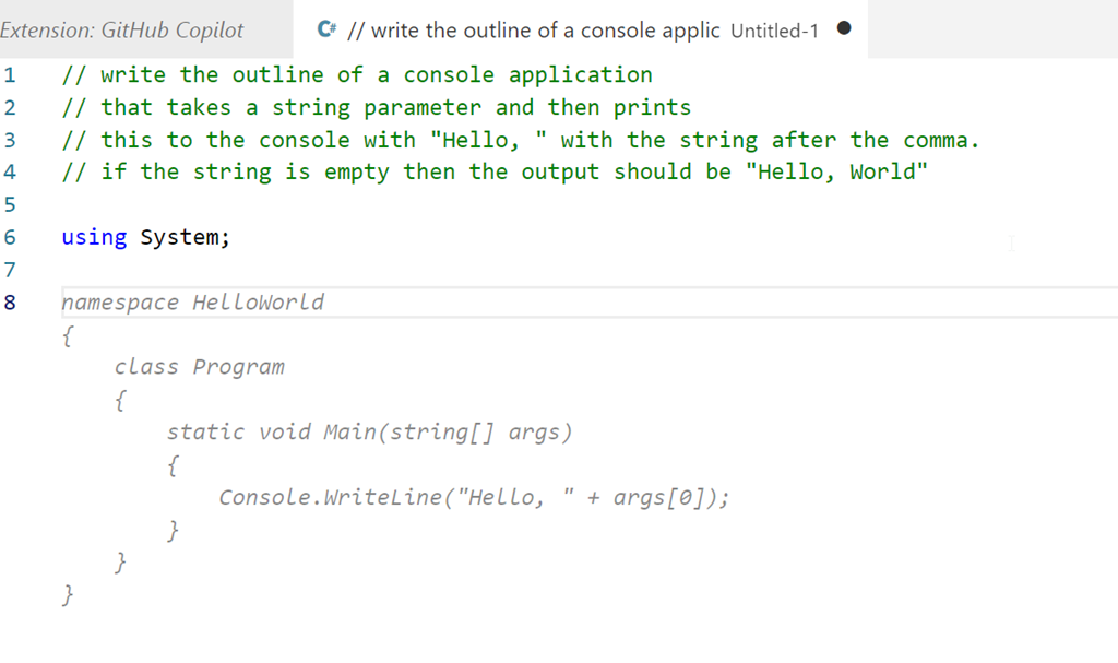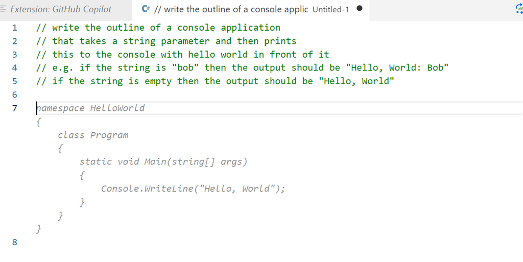 Not quite right, and I have some lines to delete, but this gives me something, and as a middling C# dev, this is helpful. Once cleaned, I compiled and ran the code, and it seemed to work, at least for a very basic console app.