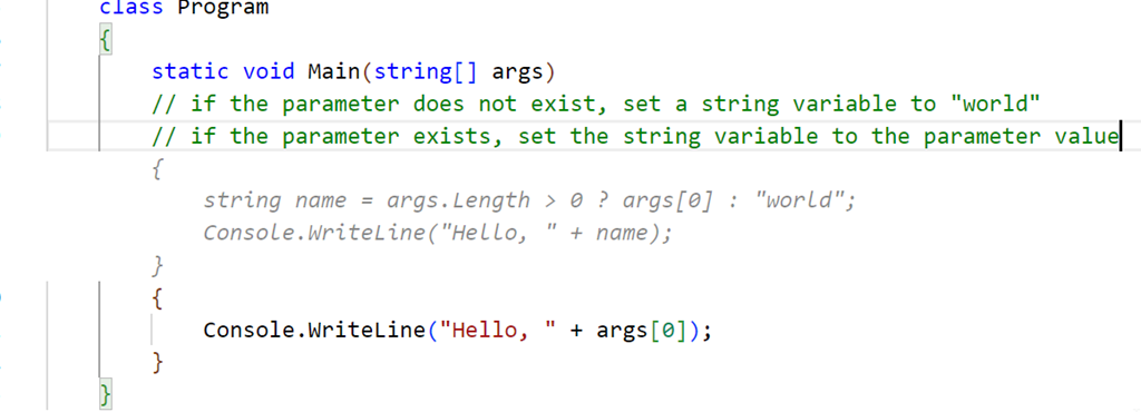 That’s better. Not great, but better. This doesn’t quite match what I asked for. I copied this to a template project and then added another comment. I want to check for the existence of the parameter, and I got this code, which is better than something I’d write.