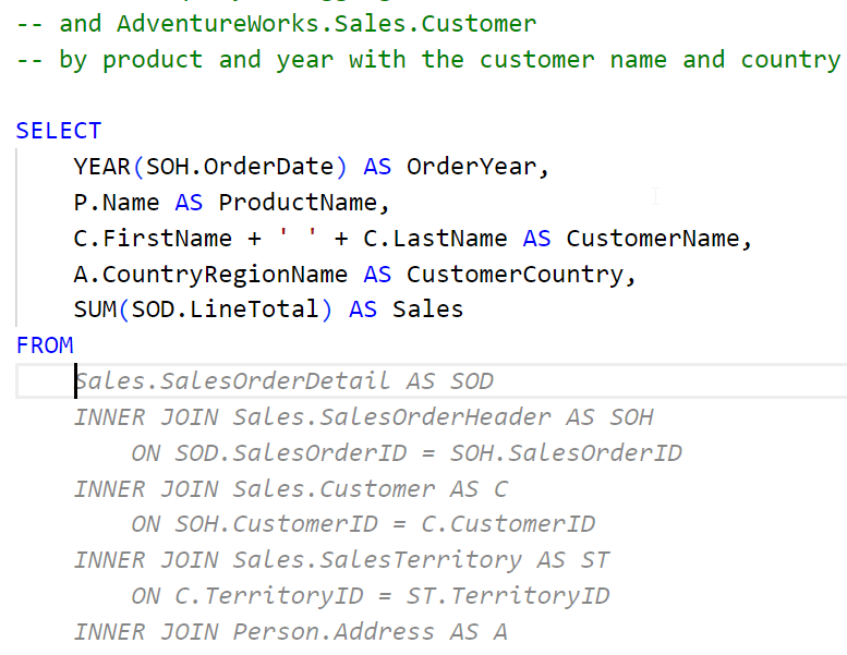 If I keep going, I get a long query, but it doens’t work. At least not on my version of AdventureWorks.