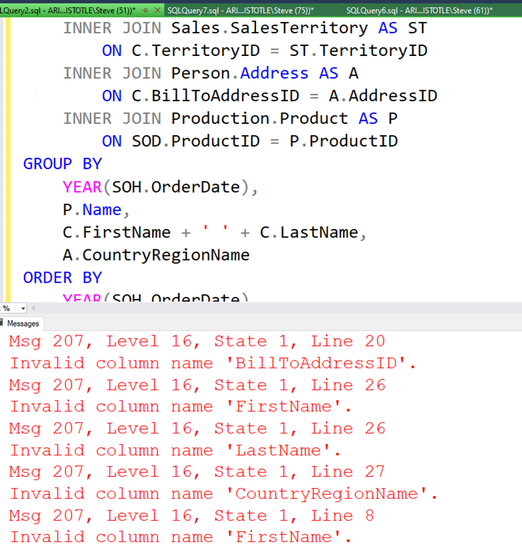 I get something else, but again, the final query doesn’t work. This time there are less errors, but the join listed seems to think the Customer table has a first name and last name, which it doesn’t.