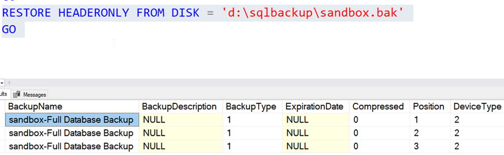 RESTORE HEADERONLY FROM DISK = 'd:\sqlbackup\sandbox.bak' GO